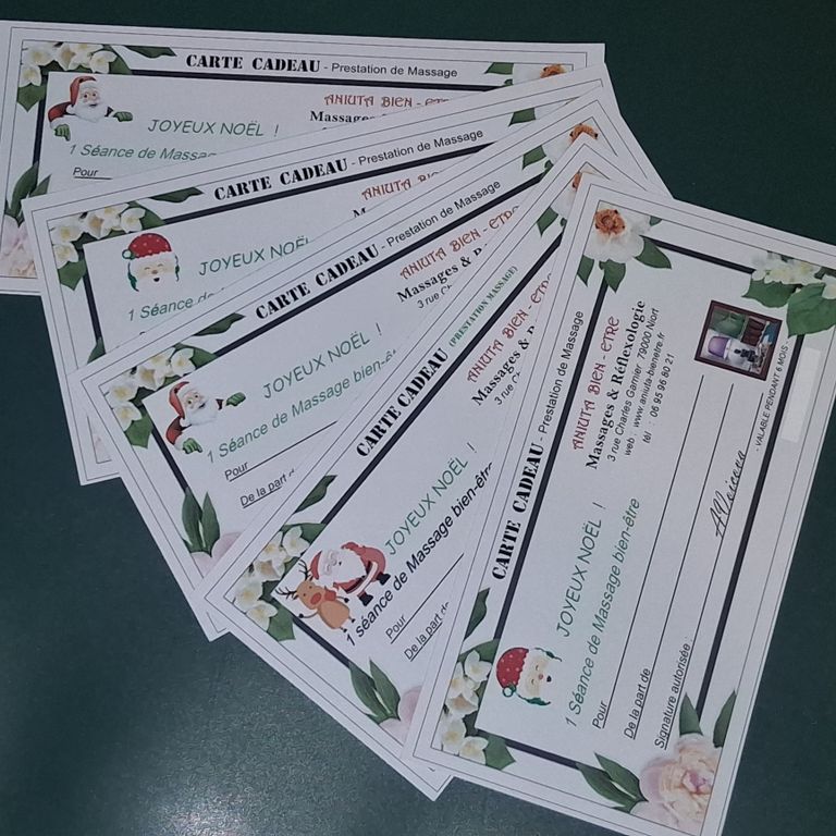 Les cartes cadeaux personnalisées peuvent être envoyés en dématérialisé par mail ou par la poste ou récupérer en format physique directement en prenant le rdv au cabinet.